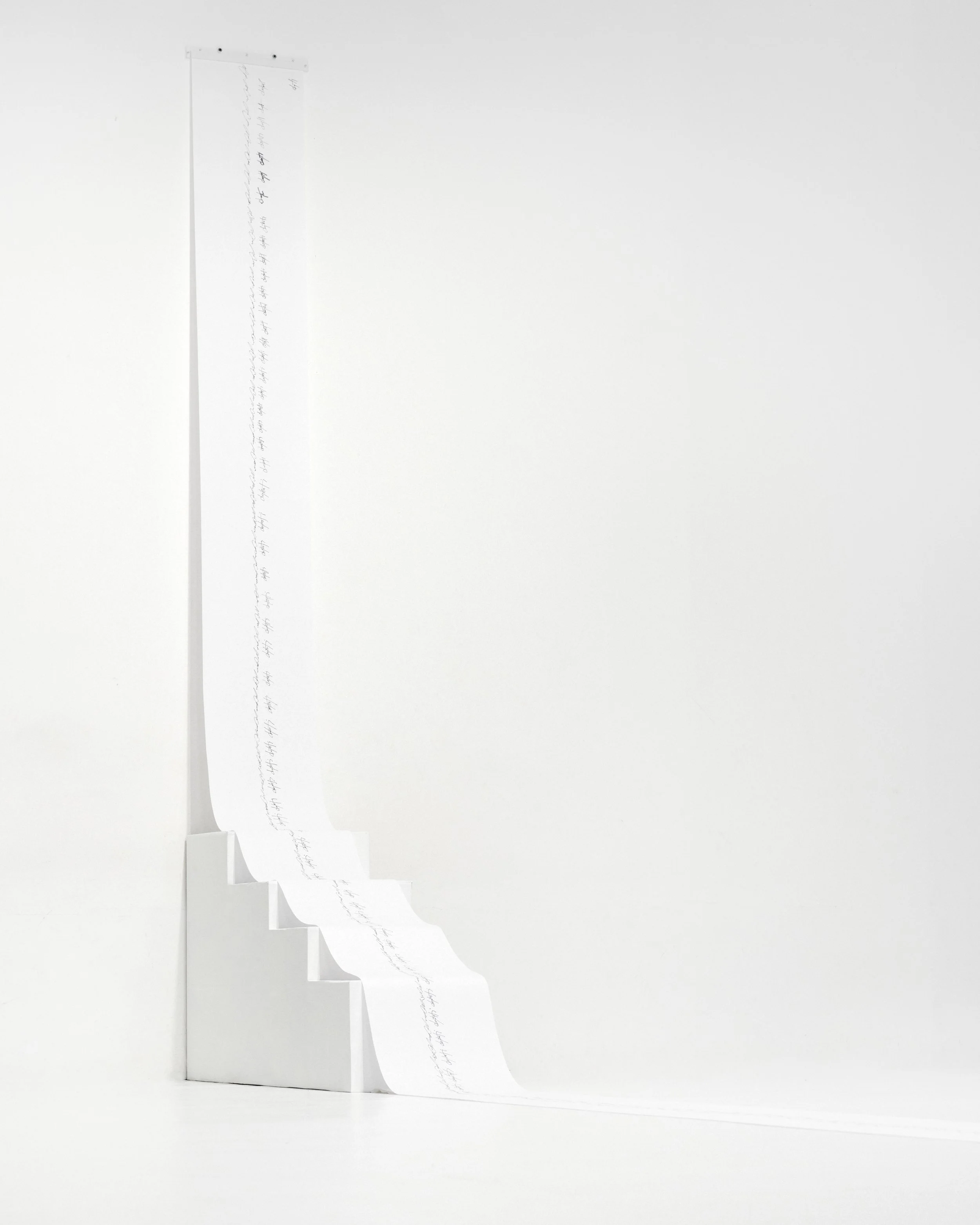 The female signature has historically devalued the price of an artwork. With Acts of Devaluation, artist duo Operator denounces this disparity and presents their signatures as a conceptual self-portrait inscribed in two critical forms: the physical, 20-meter scroll they signed in a durational performance and a digital record capturing every signature on the scroll. The latter is minted as an NFT. The artists reject the signatures' negative value and rather than omit it to secure their work’s value, sign it as many times as possible in a hyperbolic act materialized in paper and on the blockchain.
